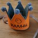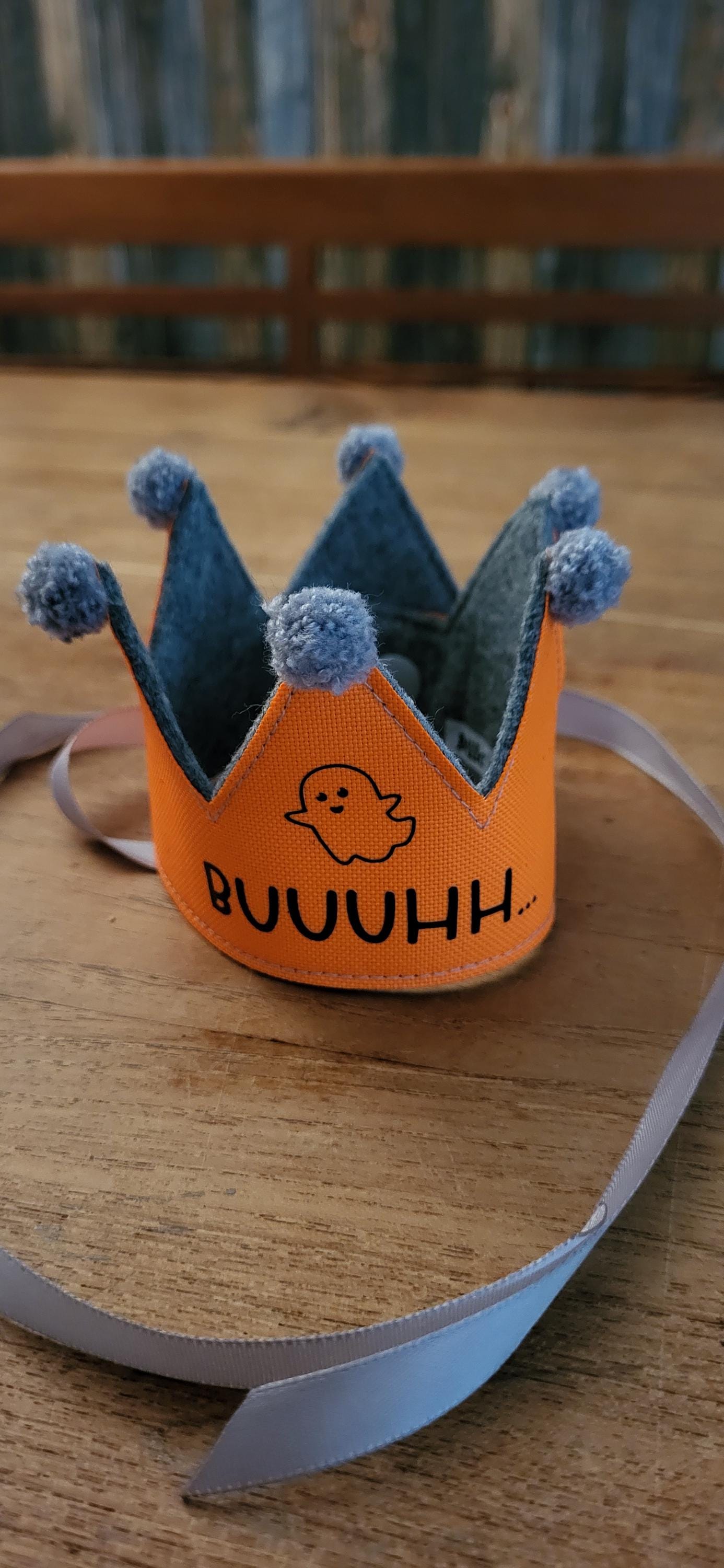 The bright orange crown with grey pom-pom is ideal for honoring a passed test such as the companion dog test or the passed rescue dog test.